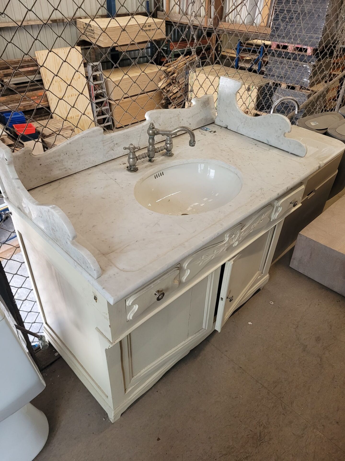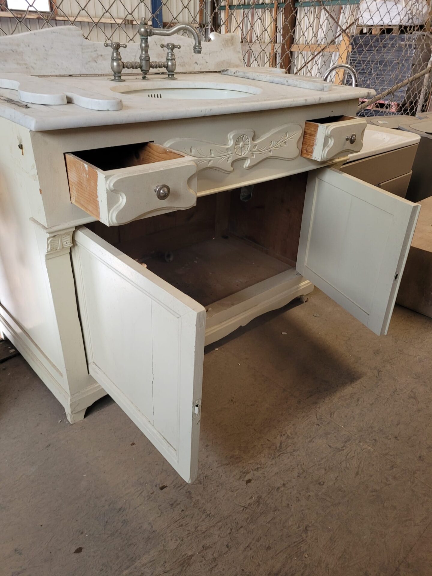Dit elegante antieke wasmeubel heeft een blad van marmer, met marmeren zijkanten en een opstaande achterzijde waarop een extra blad gelegd kan worden. De originele antieke kraan maakt het stuk extra bijzonder. Het houten onderkastje is wit uitgevoerd en heeft twee kleine, sierlijk afgewerkte lades met daartussen een fraai houtsnijwerk. Onder de lades bevinden zich twee gelijke deurtjes die veel opslagruimte bieden. Dit meubel combineert praktische indeling met authentieke charme en is een echte blikvanger in iedere ruimte. Perfect voor liefhebbers van antiek en klassieke interieurs.