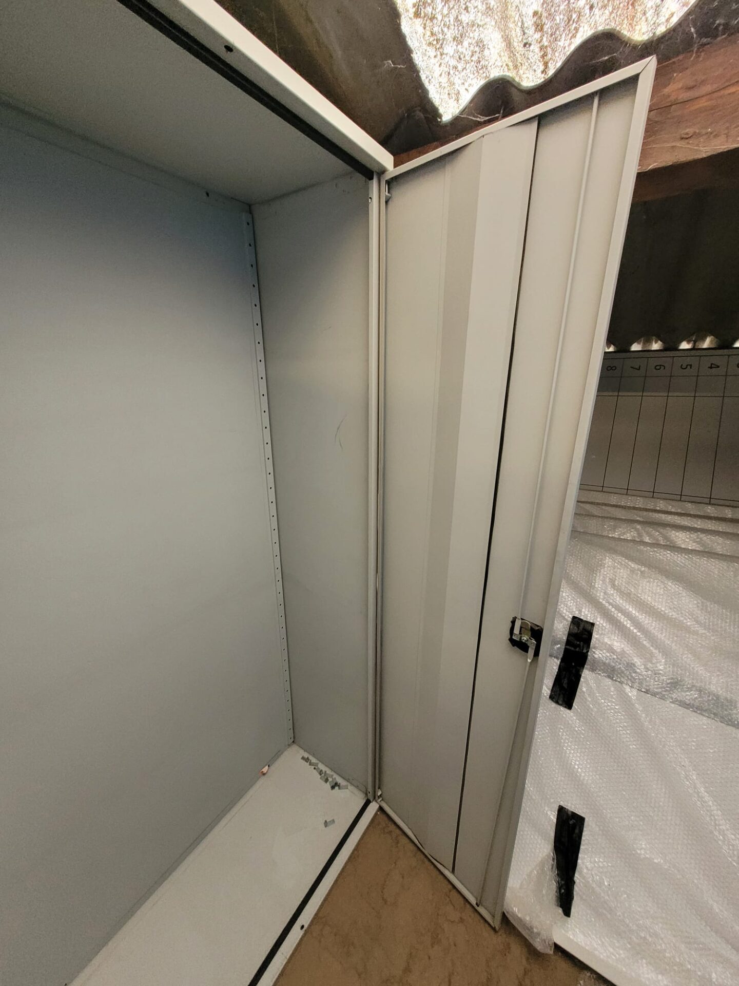 Deze gebruikte archiefkast kan zeker nog een ronde mee. Helaas zijn de legplanken niet meer aanwezig net zoals de sleutel, waardoor die een scherp prijsje heeft! De kast is 194 cm hoog, 96 cm breed en 50 cm diep.