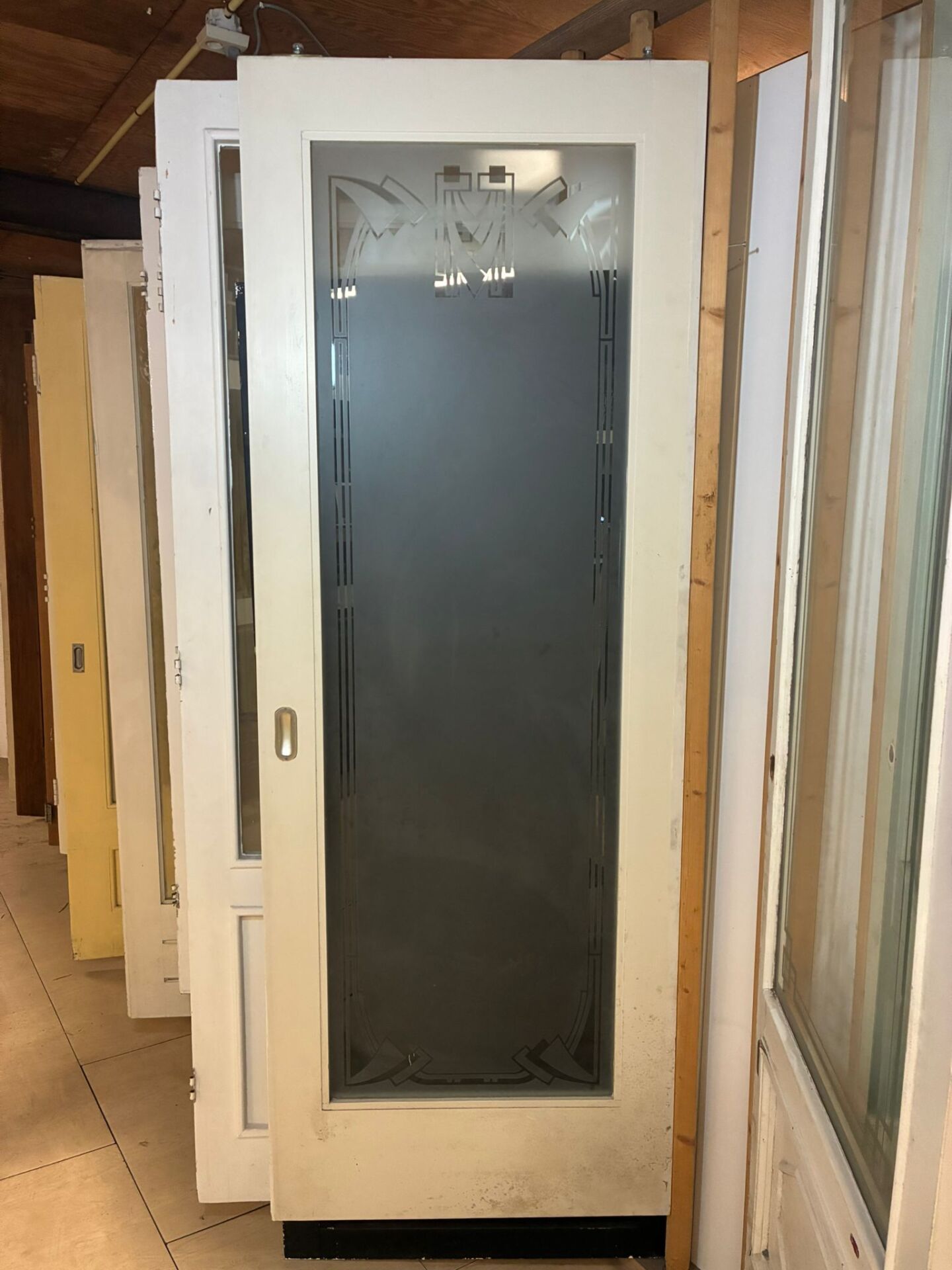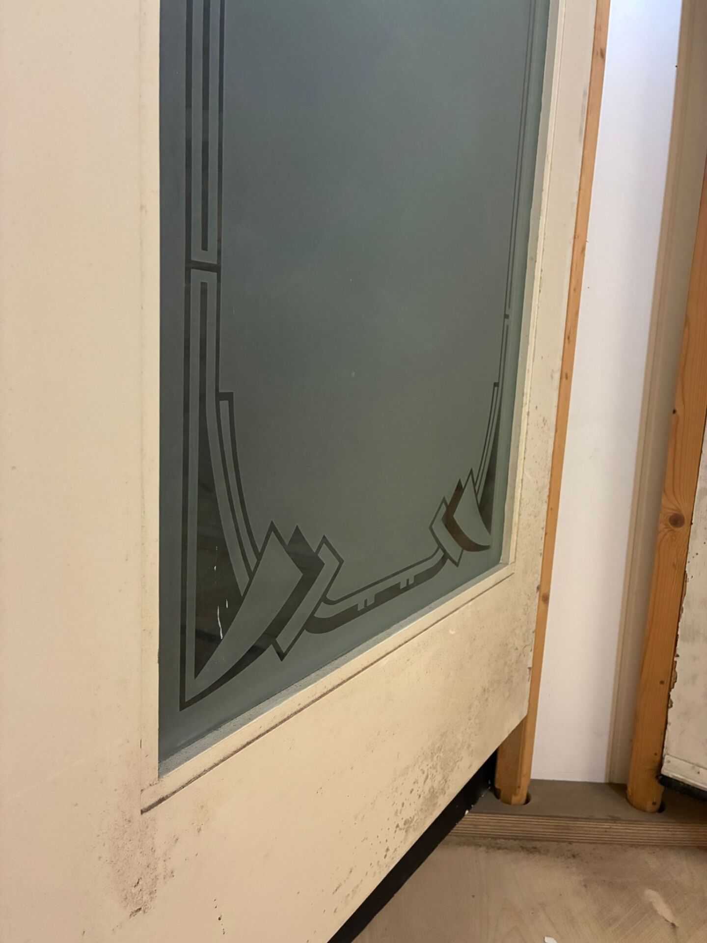 Deze prachtige oude deur is voorzien van geëtst glas met een art nouveau style. Dankzij dit bijzondere detail straalt de deur karakter en authenticiteit uit, terwijl het glas tegelijkertijd voldoende licht doorlaat en toch privacy biedt.