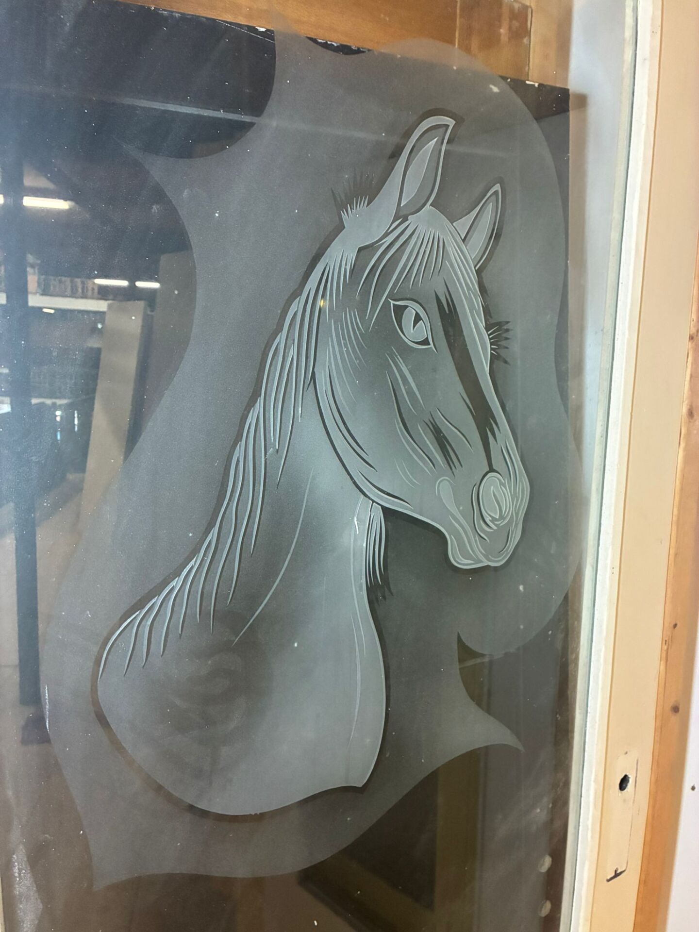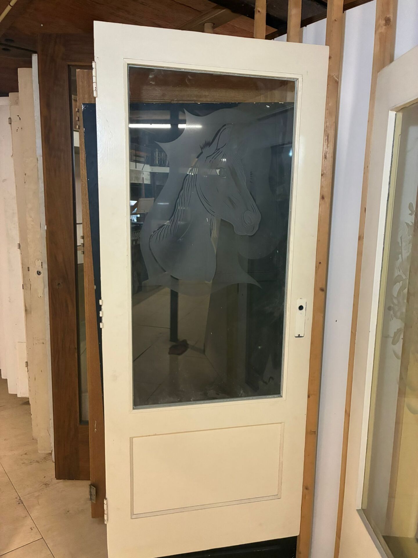 Voor de echte paarden liefhebber is deze deur! Een deur met veel glas waar een paarden hoofd in geëtst is.