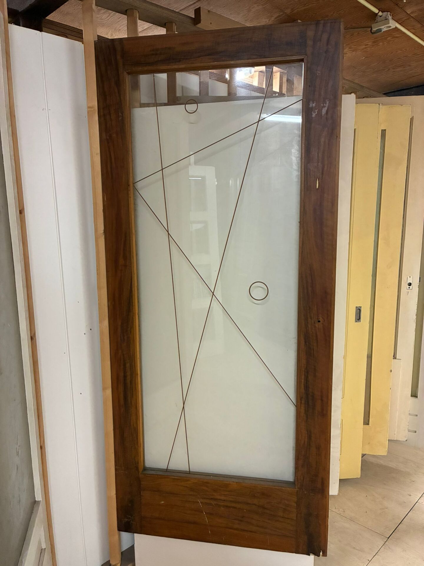 Deze prachtige oude deur is voorzien van glas met gouden/messing elementen in het glas. Dankzij dit bijzondere detail straalt de deur karakter en authenticiteit uit, terwijl het glas tegelijkertijd veel licht doorlaat en toch privacy biedt.