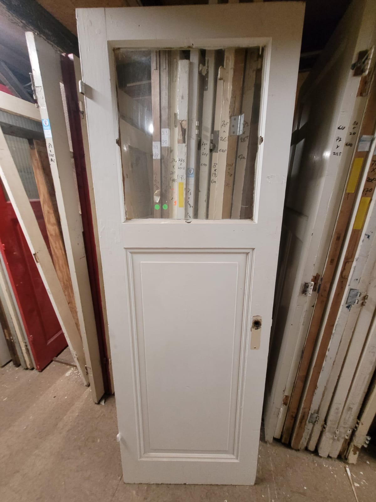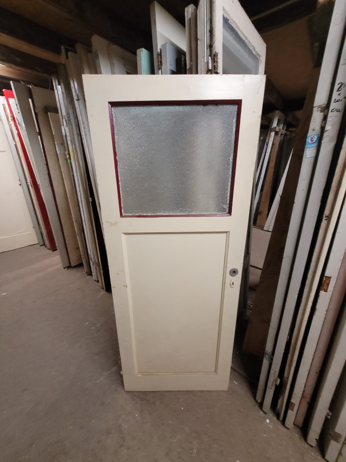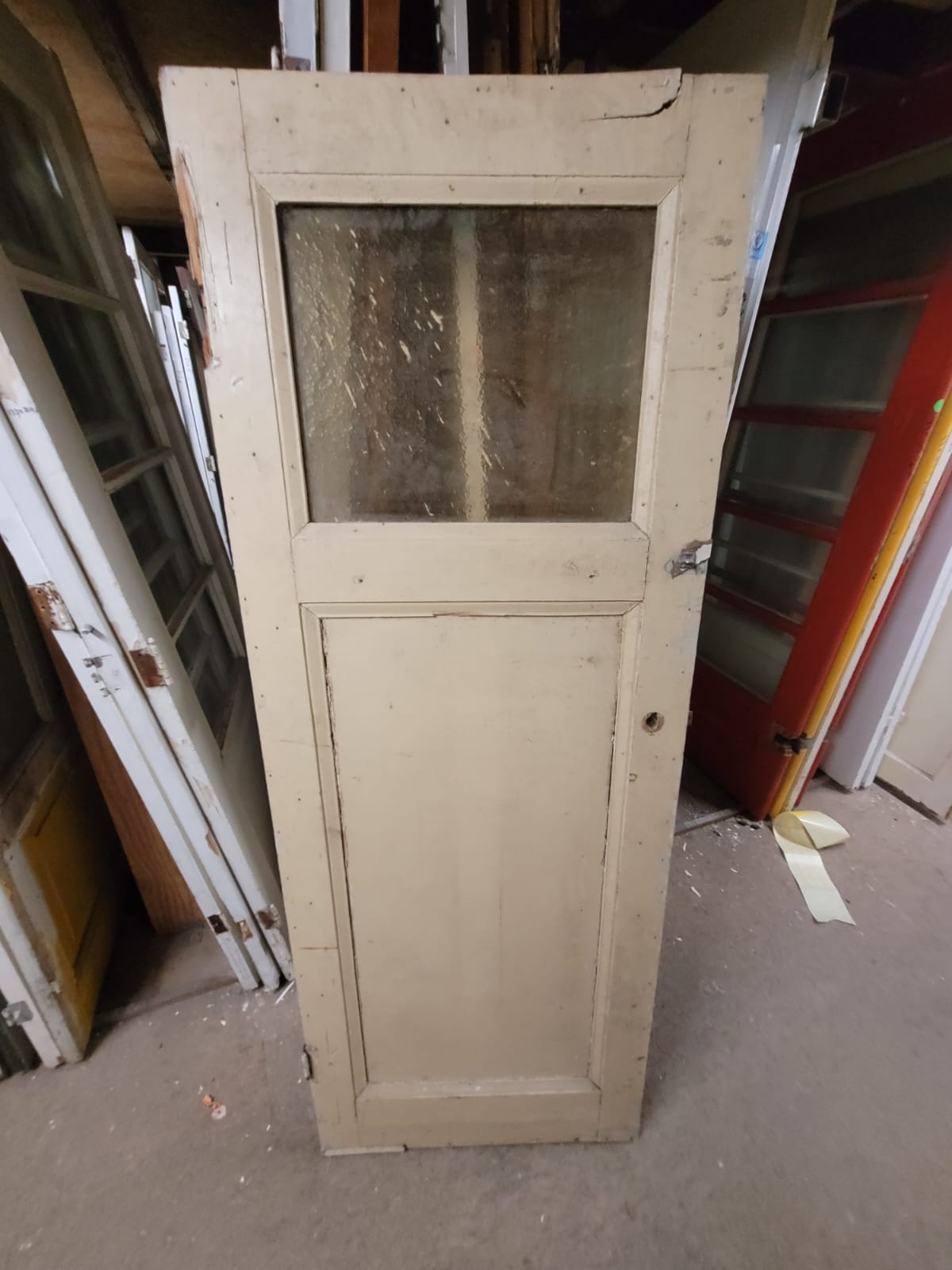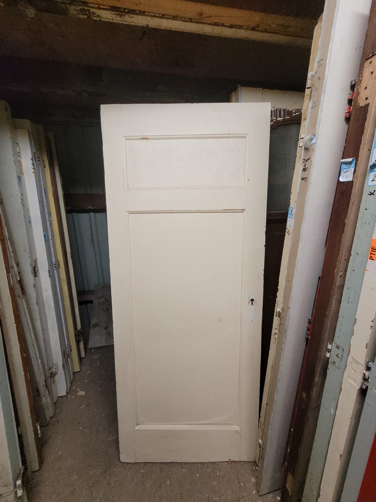 Deze deuren hebben een stijlvolle klassieke verdeling: één glasruit bovenin als bovenlicht met één houten paneel onderin. Ze zijn verkrijgbaar in allerlei glasvarianten zoals transparant, figuurglas of draadglas. Elk exemplaar heeft een andere afwerking en maatvoering. Het glas is indien gewenst te vervangen. Deurmaat niet ideaal? Geen probleem! Wij kunnen veel deuren op maat maken in onze werkplaats.