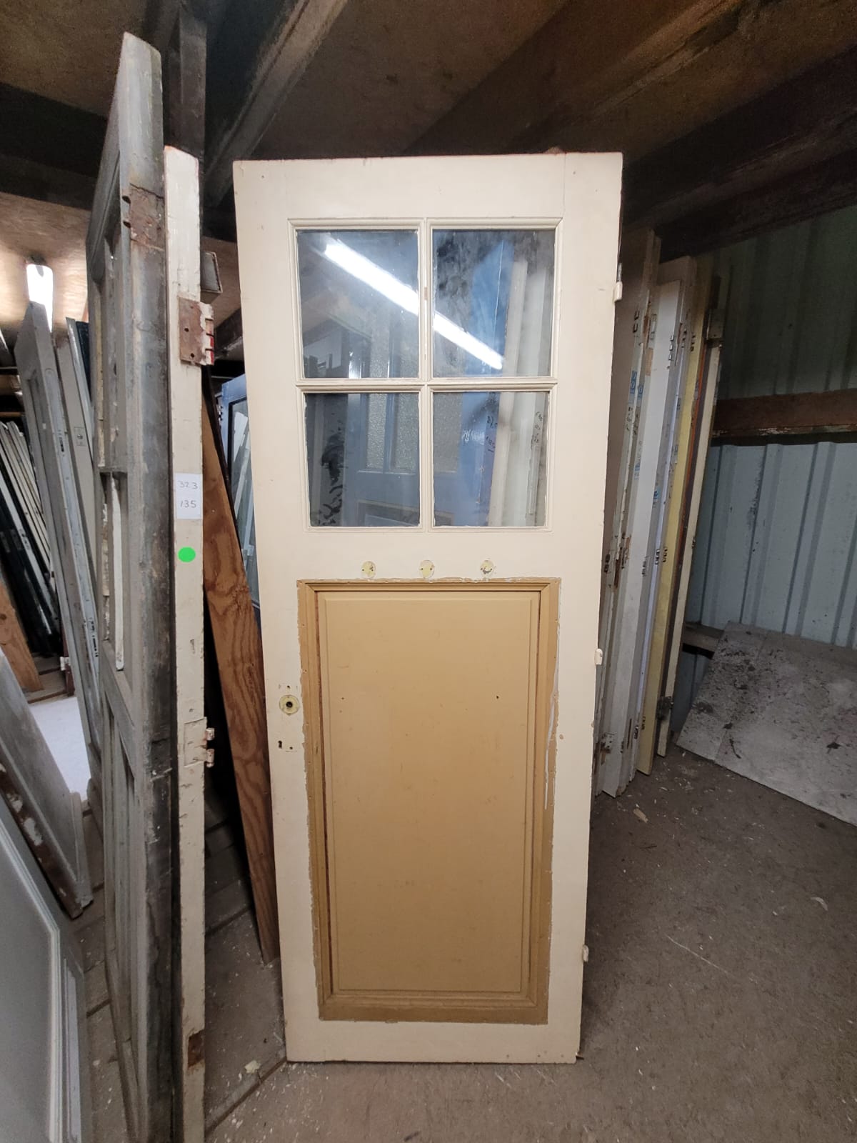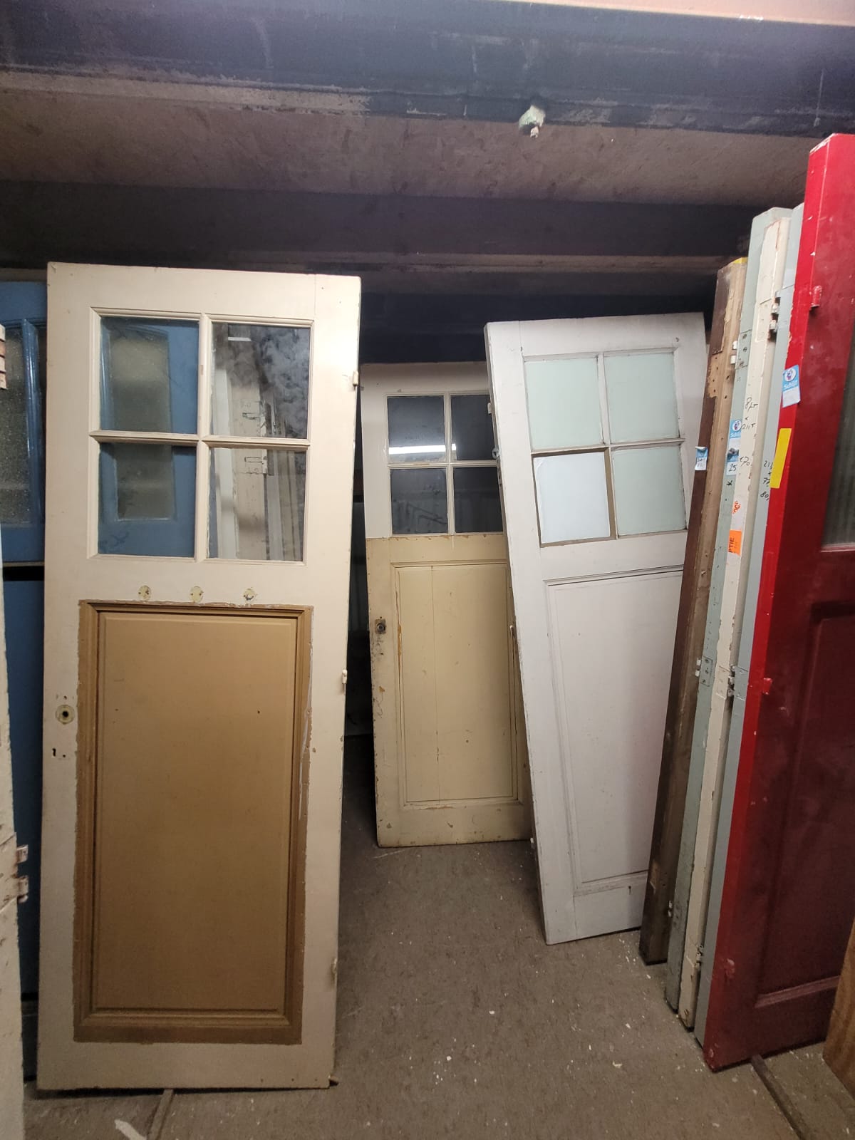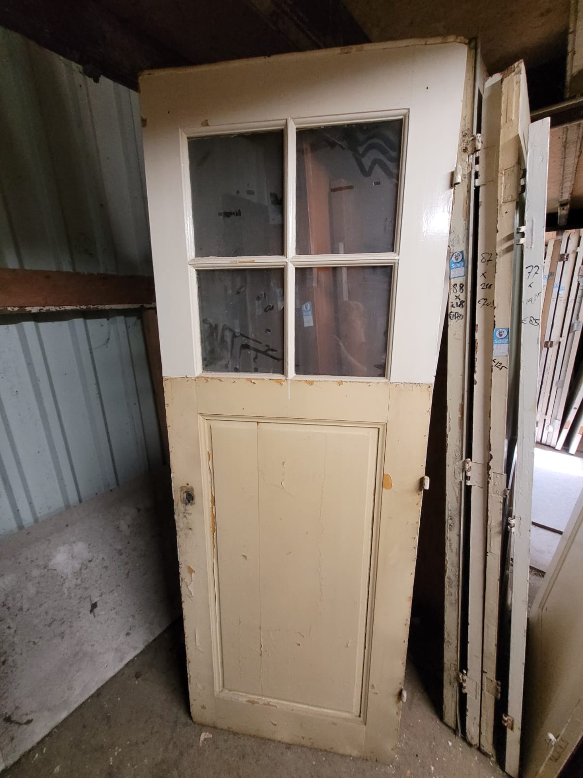Deze deuren hebben vier glasruiten als bovenlicht en één houten paneel daaronder.