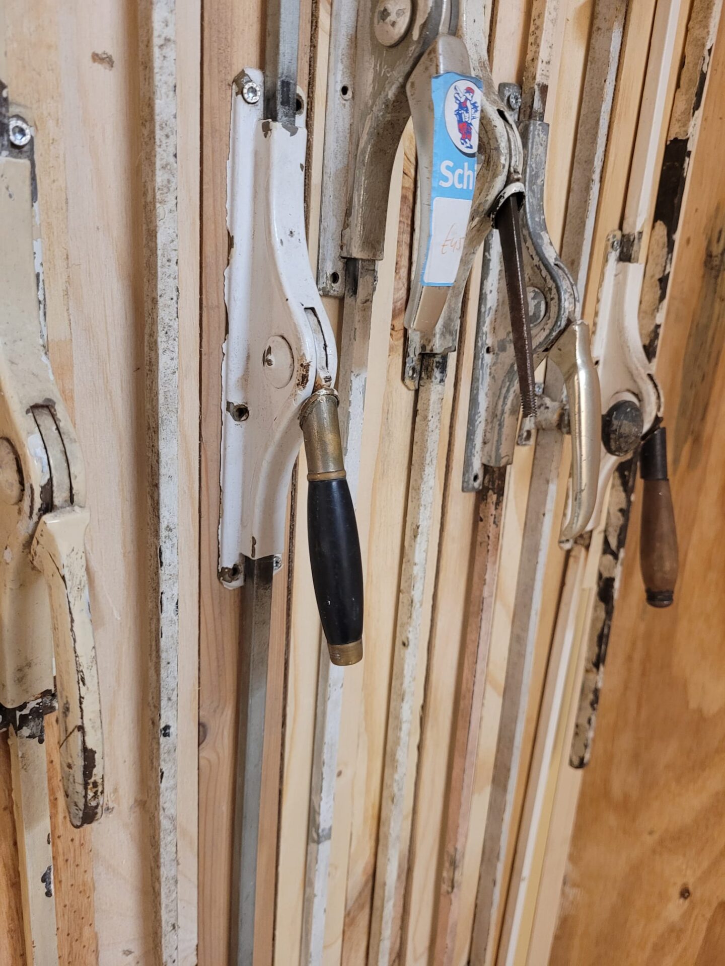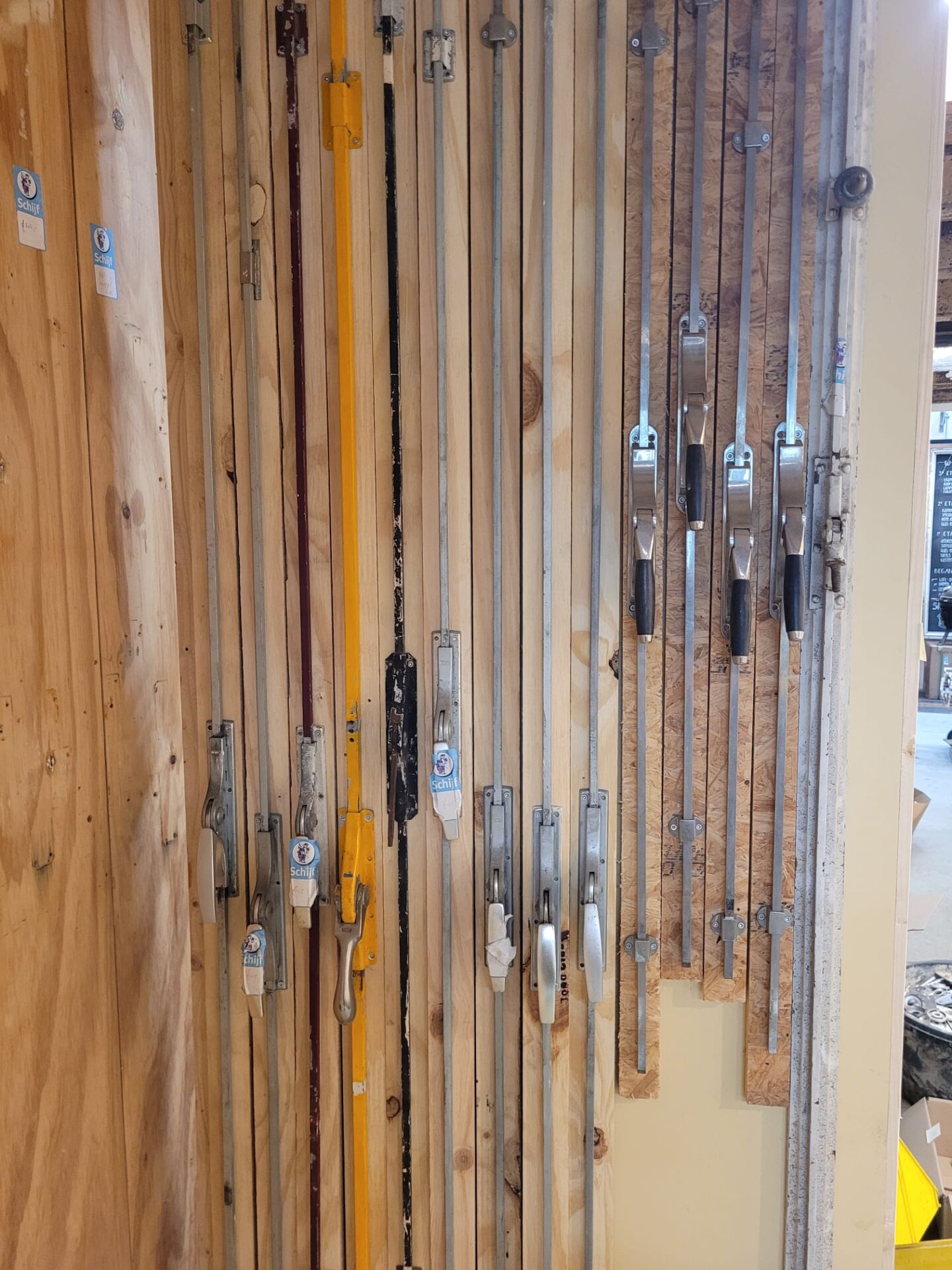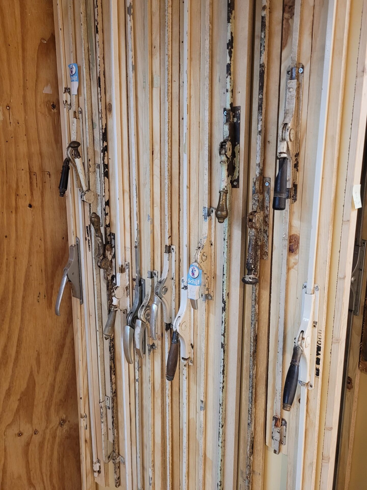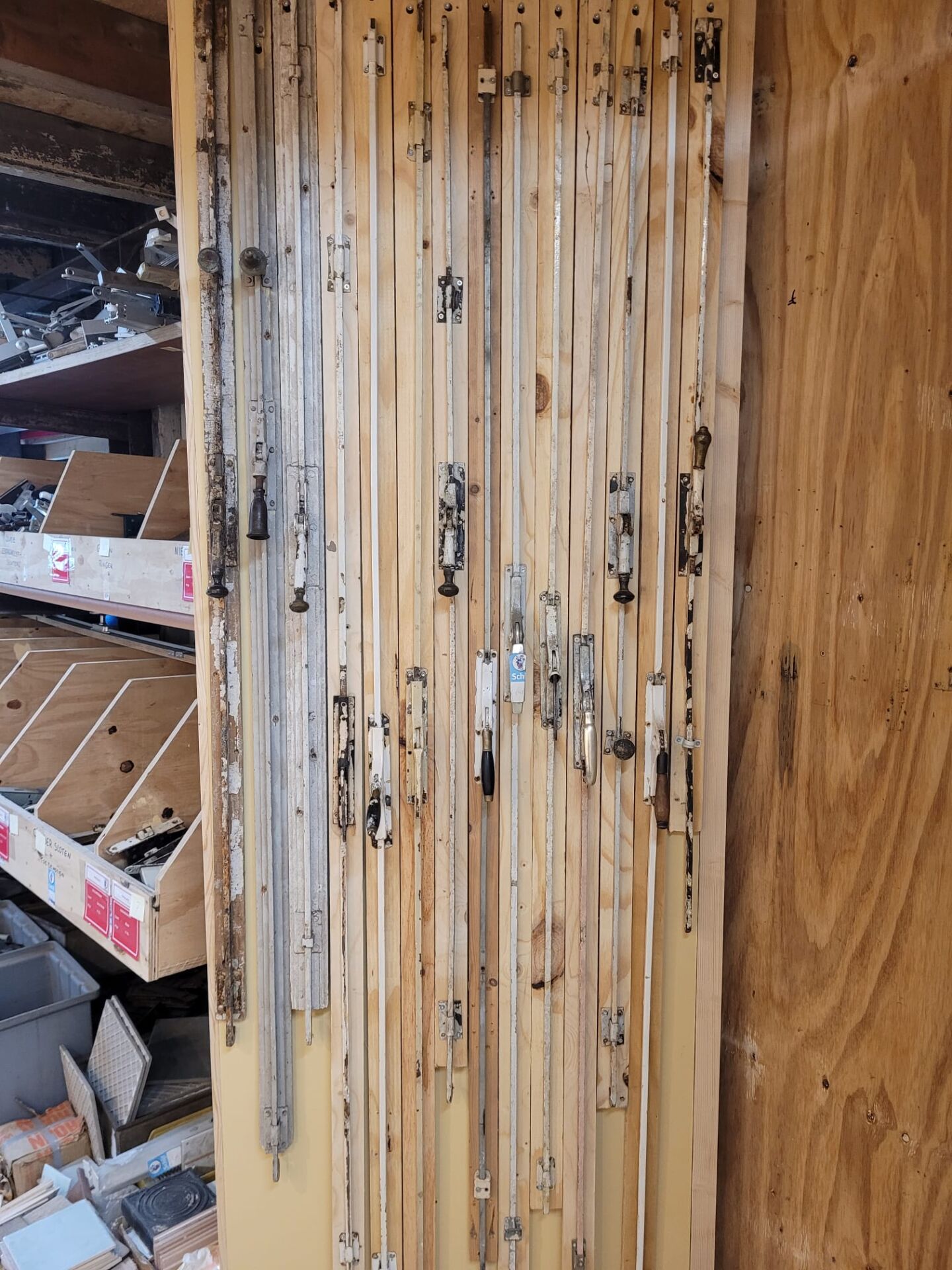 Alle complete espagnoletten zijn overzichtelijk opgehangen, zodat je ze goed kunt bekijken en vergelijken. Handig wanneer je wilt zien hoe het werkt, welk formaat je nodig hebt of wat qua stijl het best past bij jouw project. Sommige zijn nog voorzien van oude verf of patina, wat zorgt voor een authentieke uitstraling bij renovaties of karakteristieke interieurs.