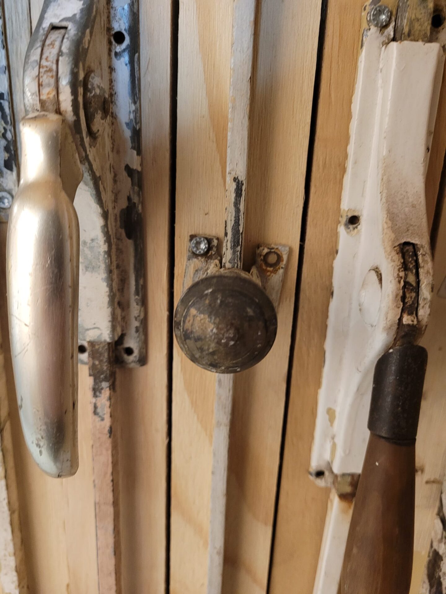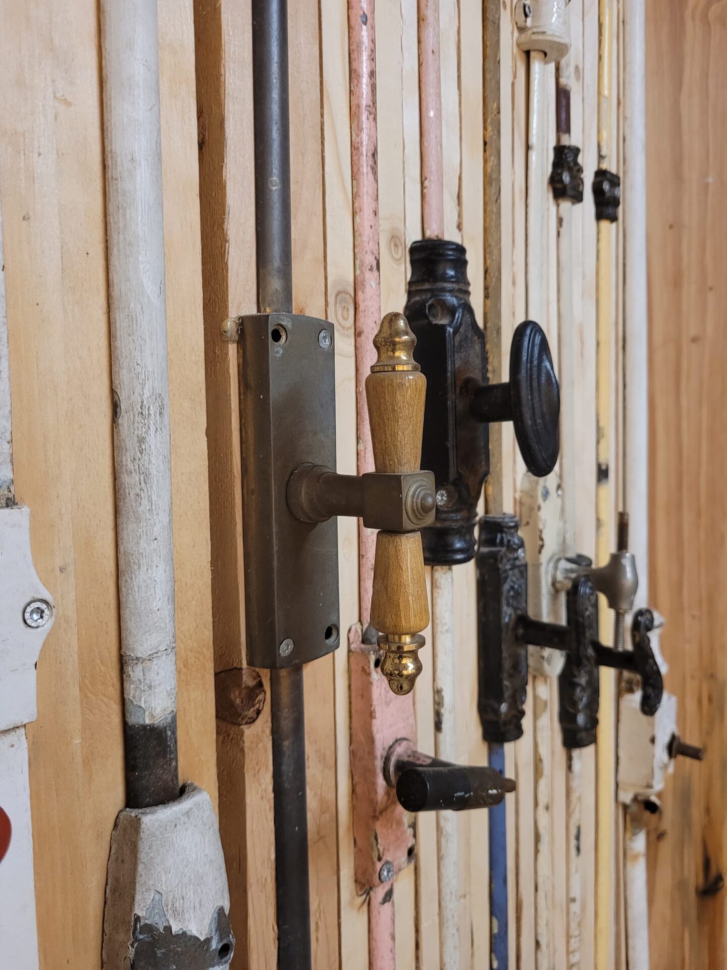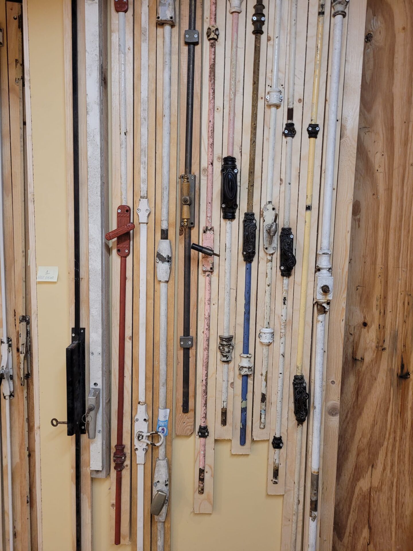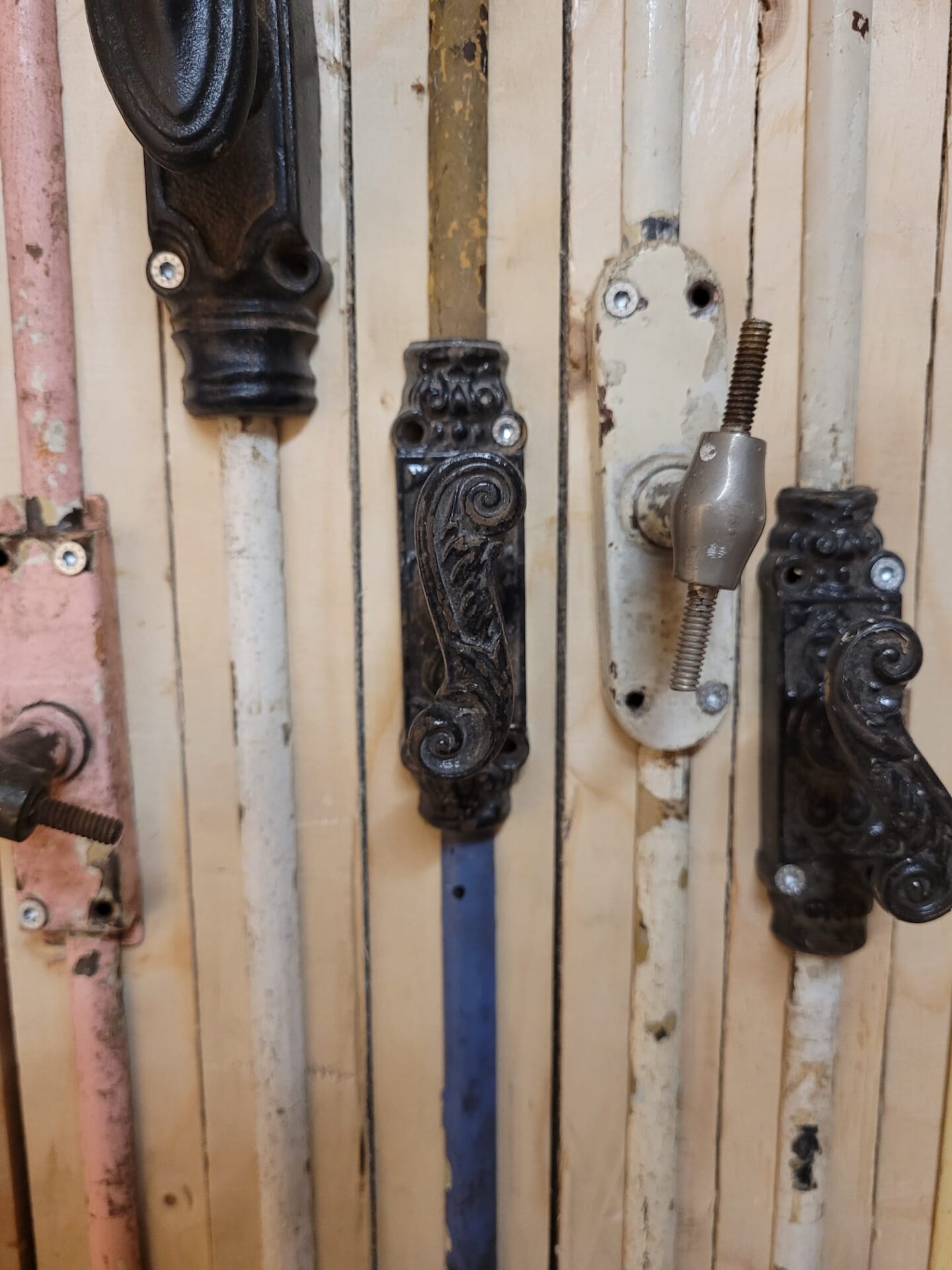 Alle complete espagnoletten zijn overzichtelijk opgehangen, zodat je ze goed kunt bekijken en vergelijken. Handig wanneer je wilt zien hoe het werkt, welk formaat je nodig hebt of wat qua stijl het best past bij jouw project. Sommige zijn nog voorzien van oude verf of patina, wat zorgt voor een authentieke uitstraling bij renovaties of karakteristieke interieurs.