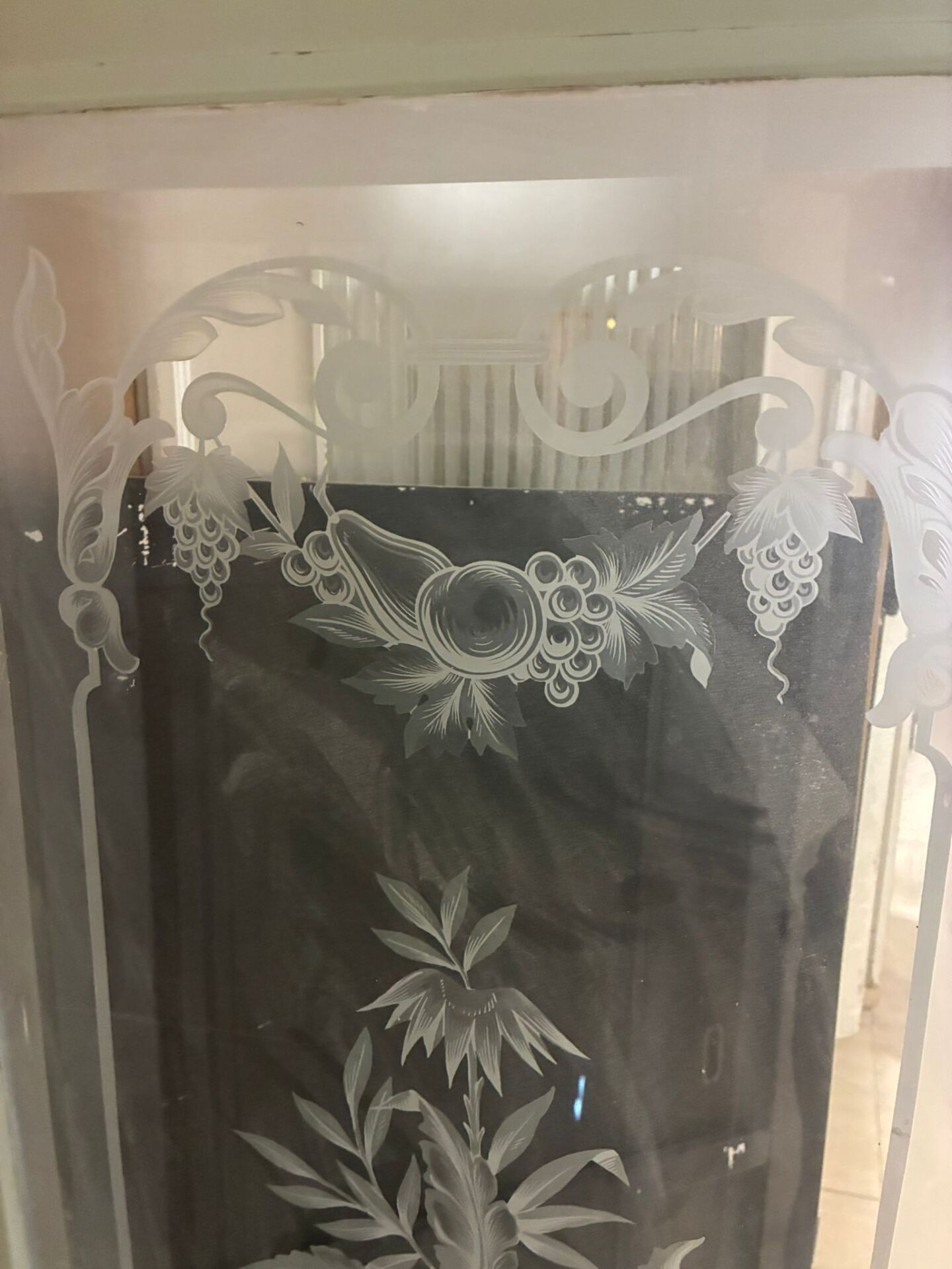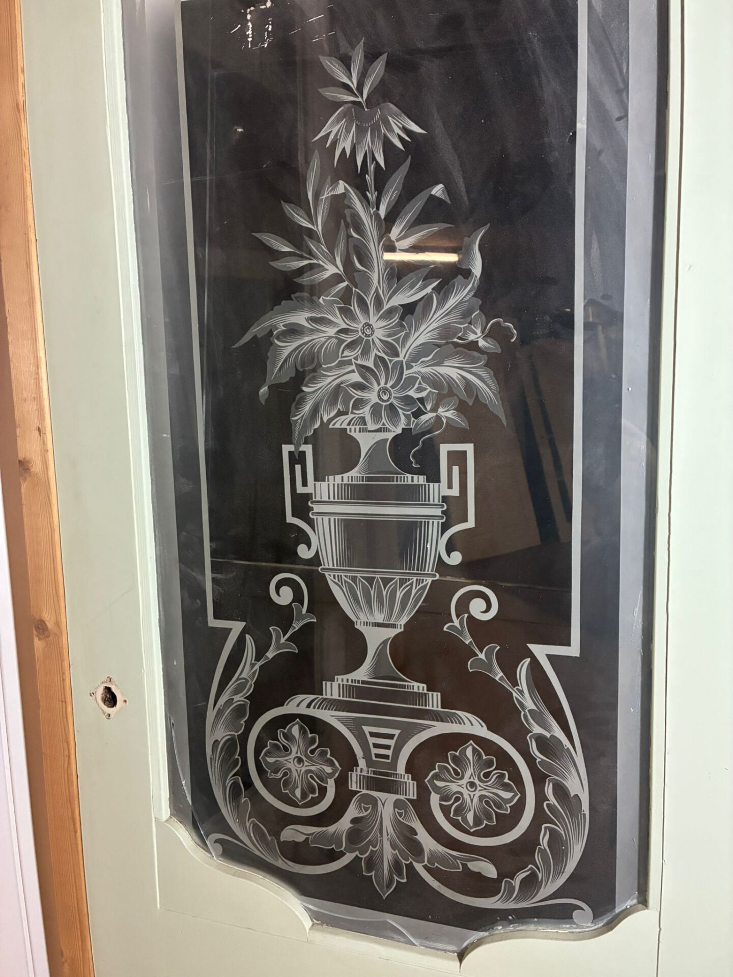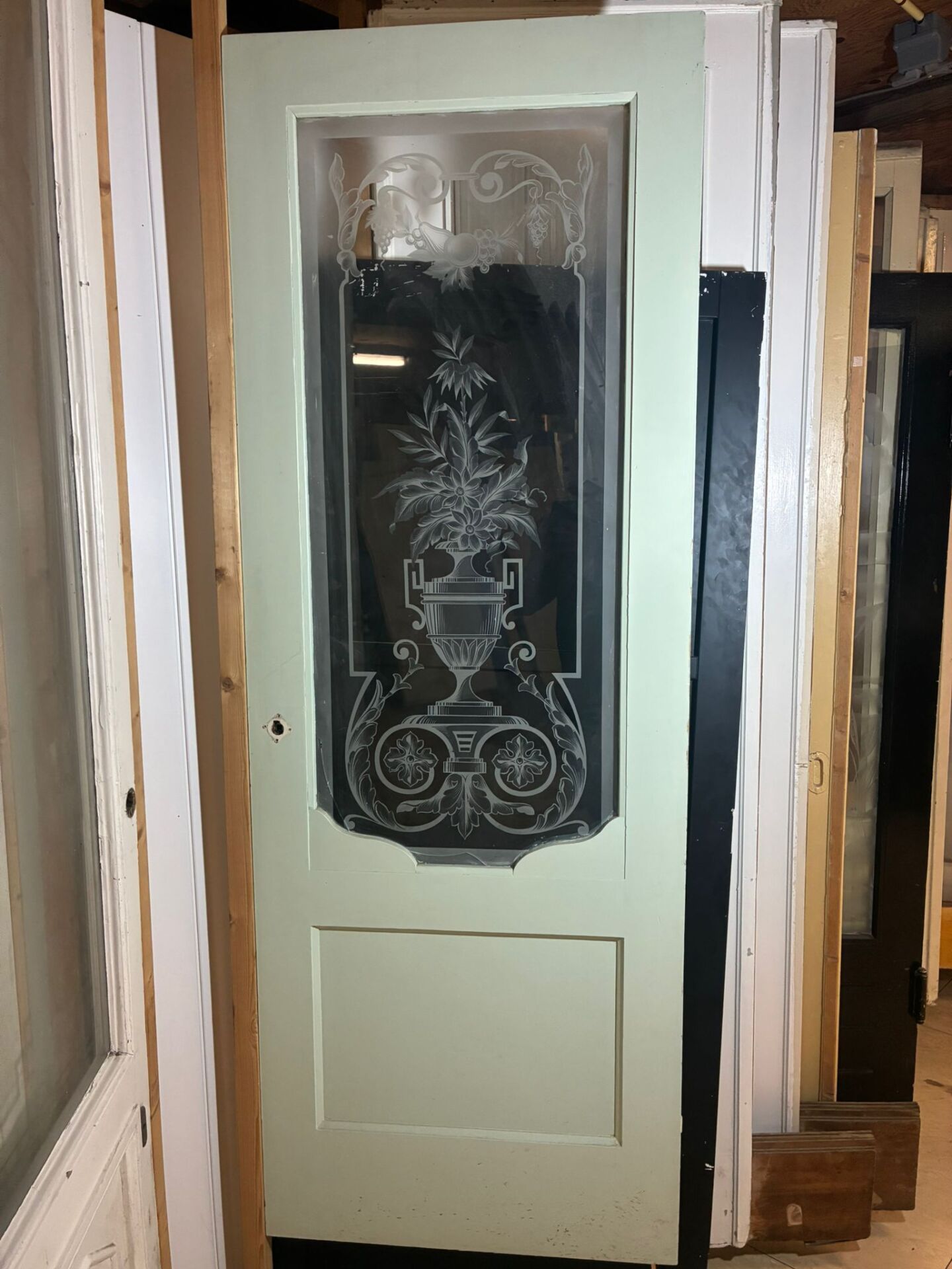 Deze prachtige oude deur is voorzien van geëtst glas met een art nouveau vaas met bloemen. Dankzij dit bijzondere detail straalt de deur karakter en authenticiteit uit, terwijl het glas tegelijkertijd voldoende licht doorlaat en toch privacy biedt.