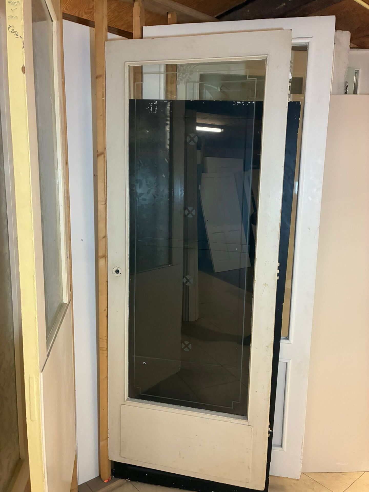 Deze prachtige oude deur met geëtst cirkels met kruizen erin, in het glas. Dankzij dit bijzondere detail straalt de deur karakter en authenticiteit uit, terwijl het glas tegelijkertijd voldoende licht doorlaat en toch privacy biedt.