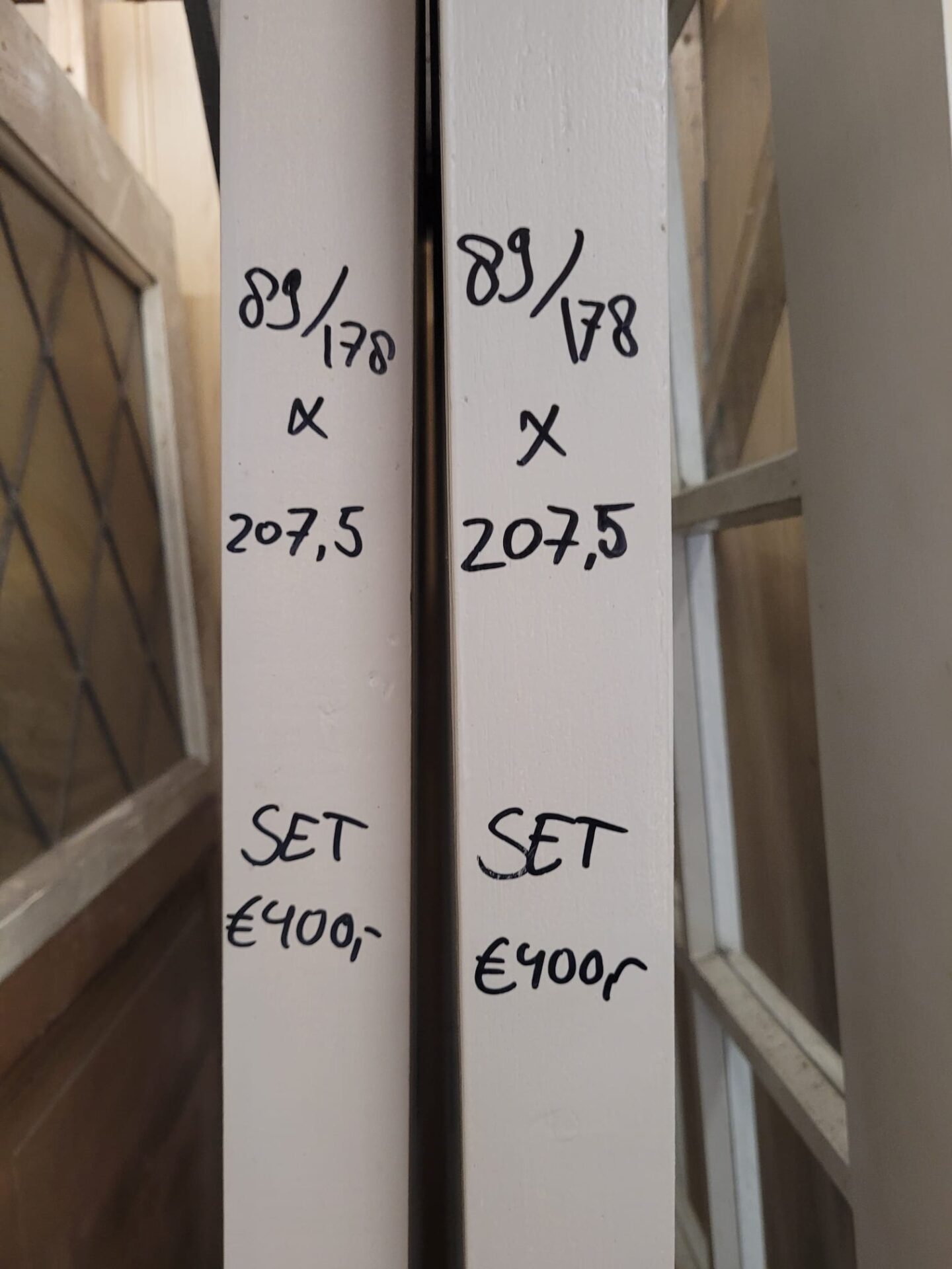 Set schuifdeuren met geëtst glas, afmeting 89 x 207,5 cm. Op het glas zijn wiebers geëtst. Kom langs in de winkel om in het echt te bekijken.