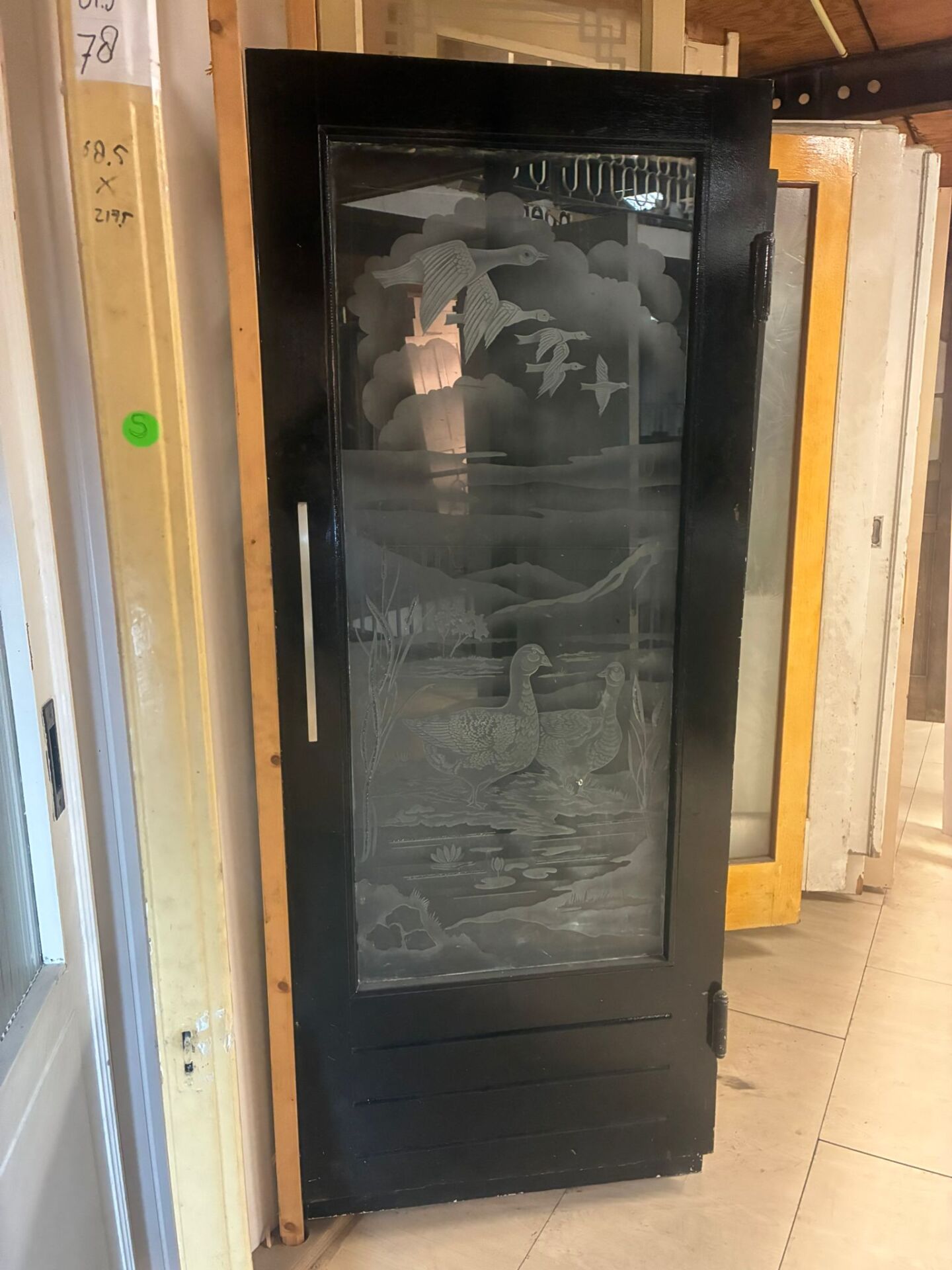 Bijzondere geëtste deur met groot glas. Op het glas in een natuurlijke scene verschillende vogels weergegeven.
