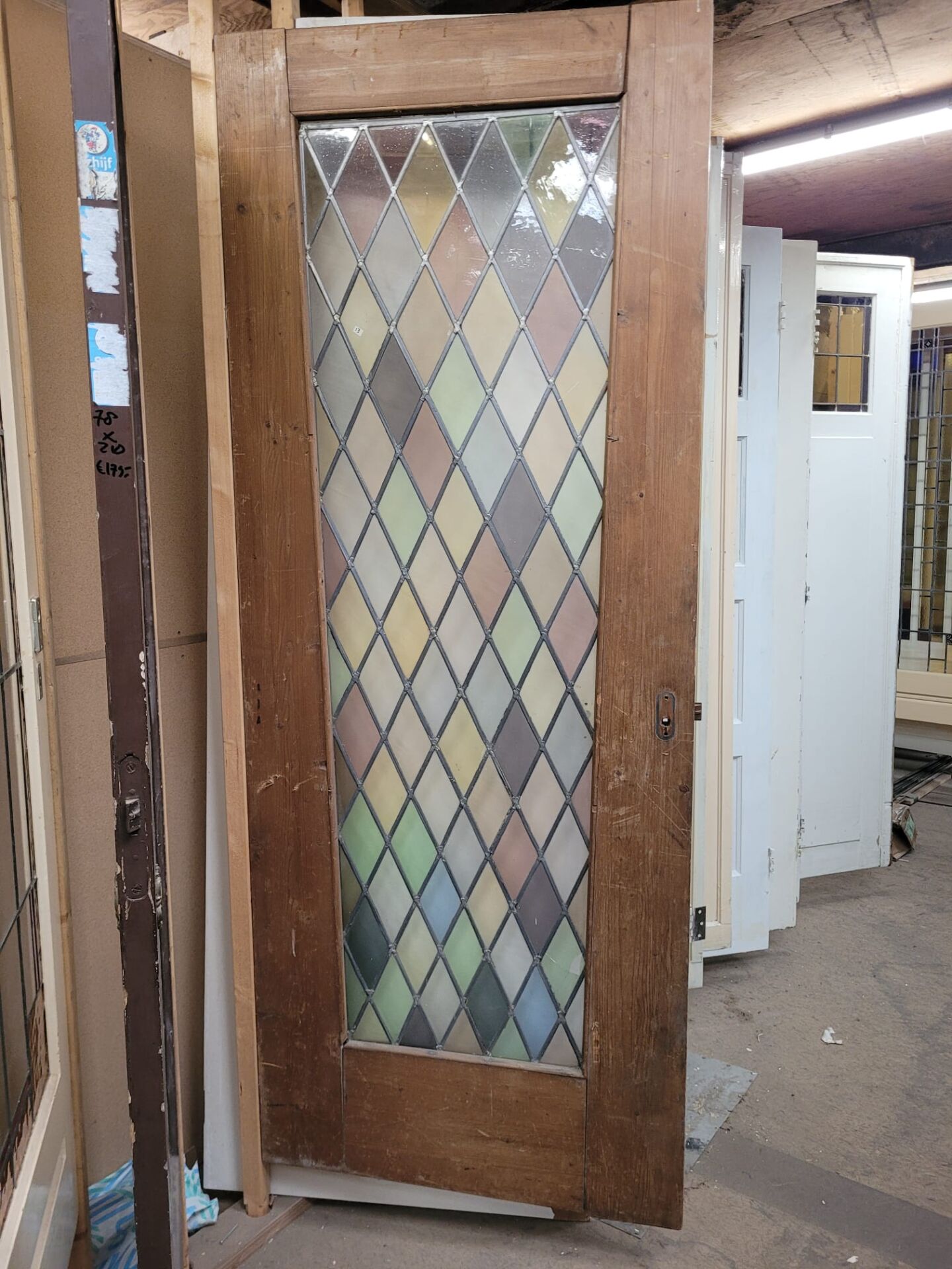 Op de tweede verdieping hebben we al onze glas in lood deuren in een waaier hangen. Hier kan gemakkelijk door de deuren gebladerd worden, zonder de deuren te beschadigen. Voor het fotograferen van de deuren hebben we een vlakke witte deur achter de glas in lood deuren gezet om zo goed mogelijk het glas in lood te kunnen vast leggen. Wil je de deur in volle pracht zien? Kom langs in de winkel om elk detail met eigen ogen te bekijken.