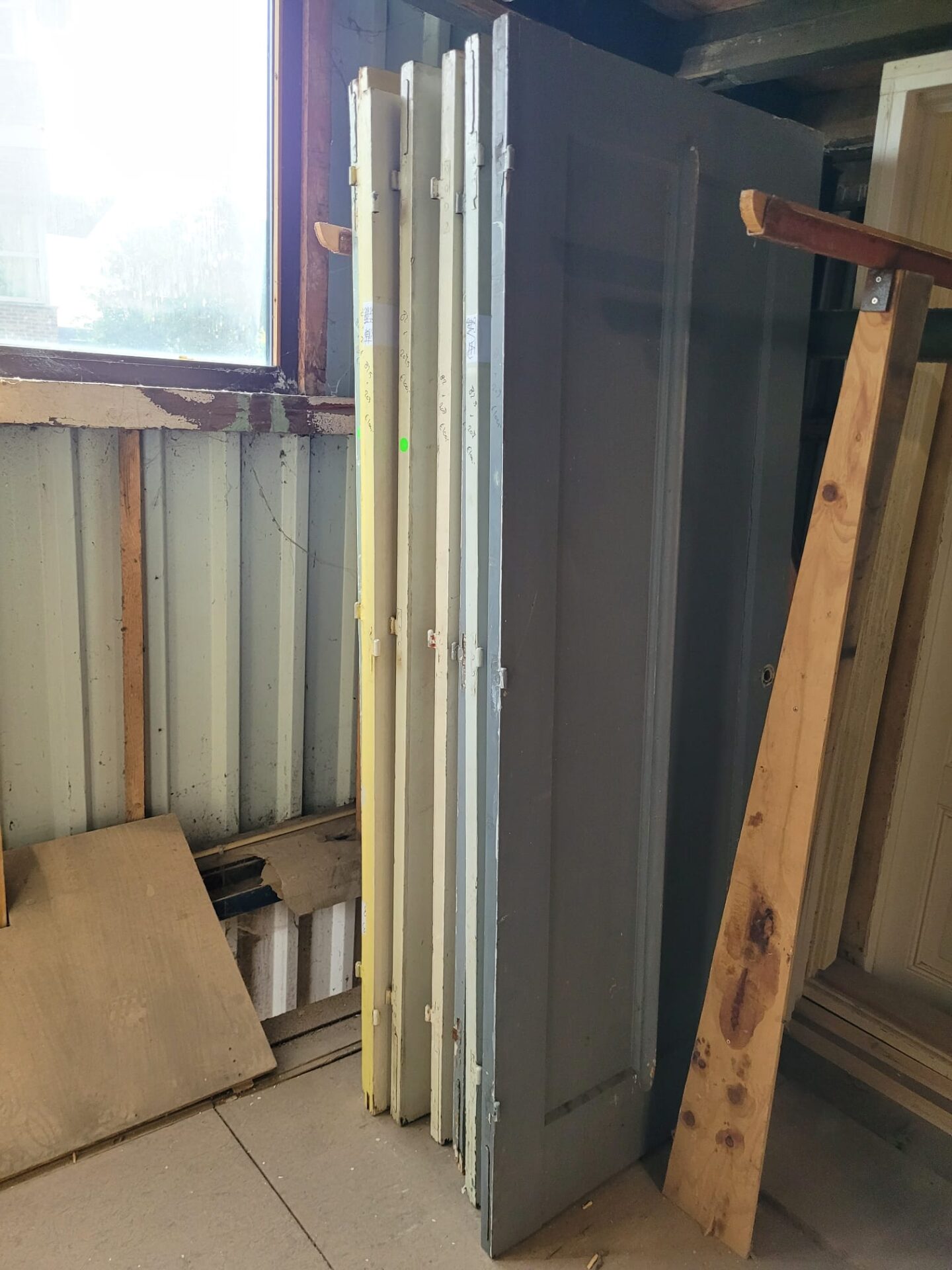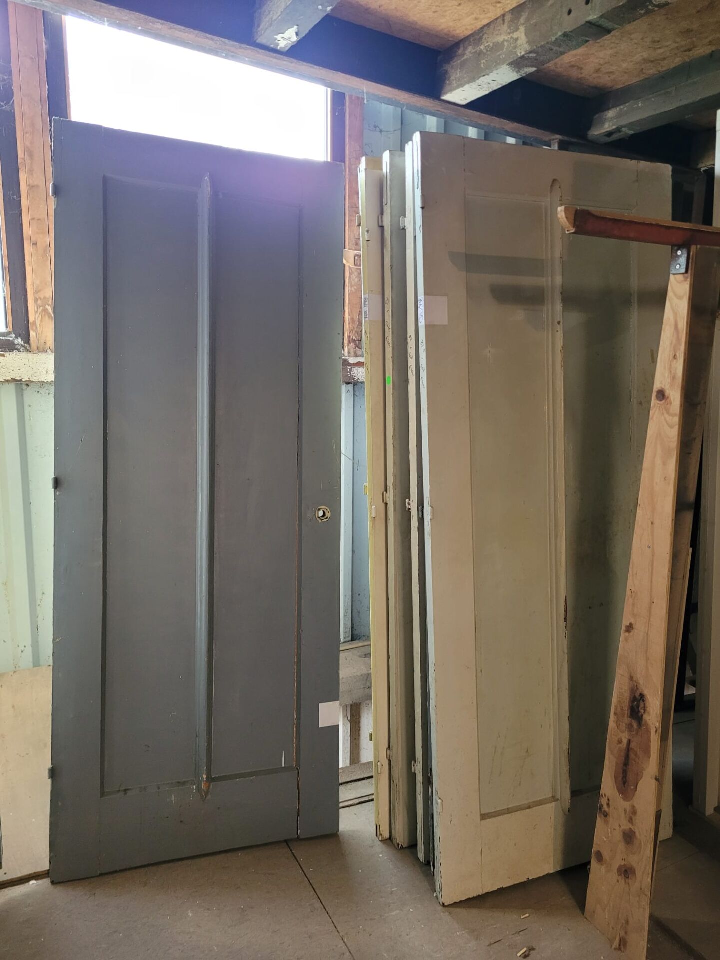 In onze gangpad 12 hebben we 3 bijzondere deuren die afkomstig zijn uit een oude monumentenwinkel. Deze deuren hebben een éénvlak ontwerp met een sierlat in het midden, waardoor het lijkt alsof er twee vlakken zijn. Aan beide zijden is het uiterlijk identiek.