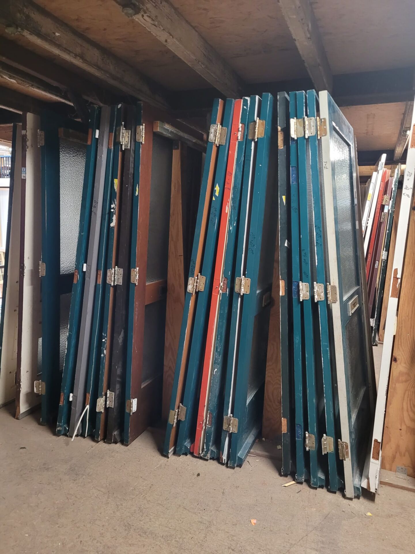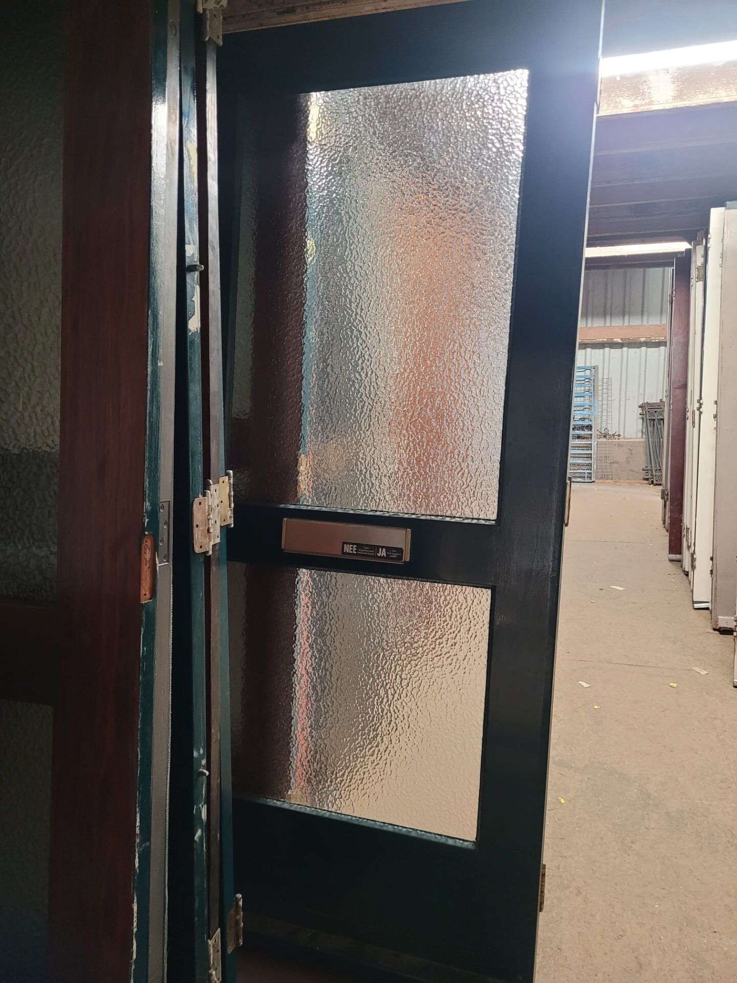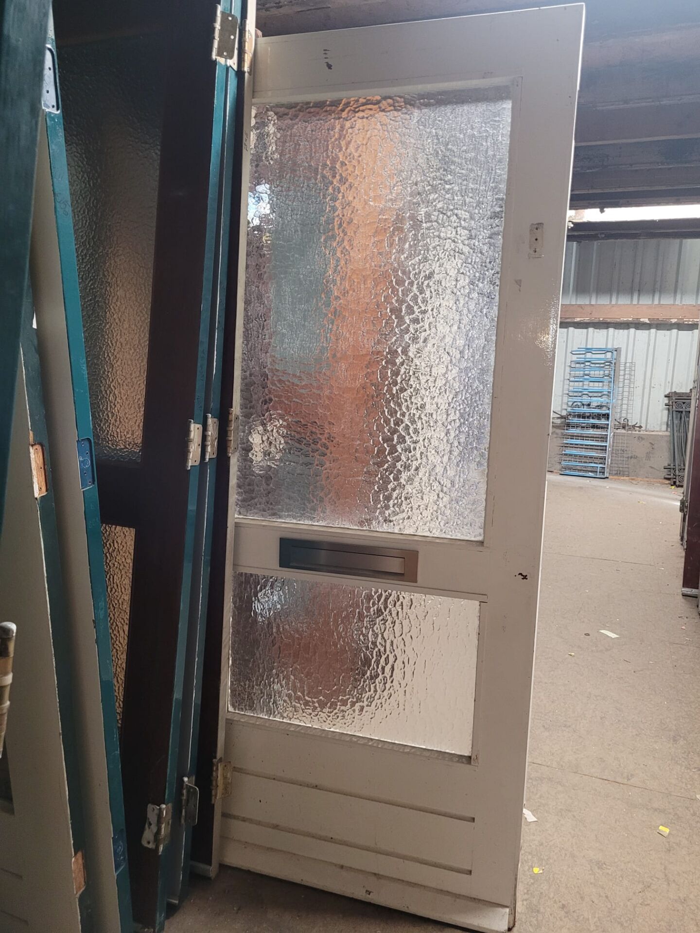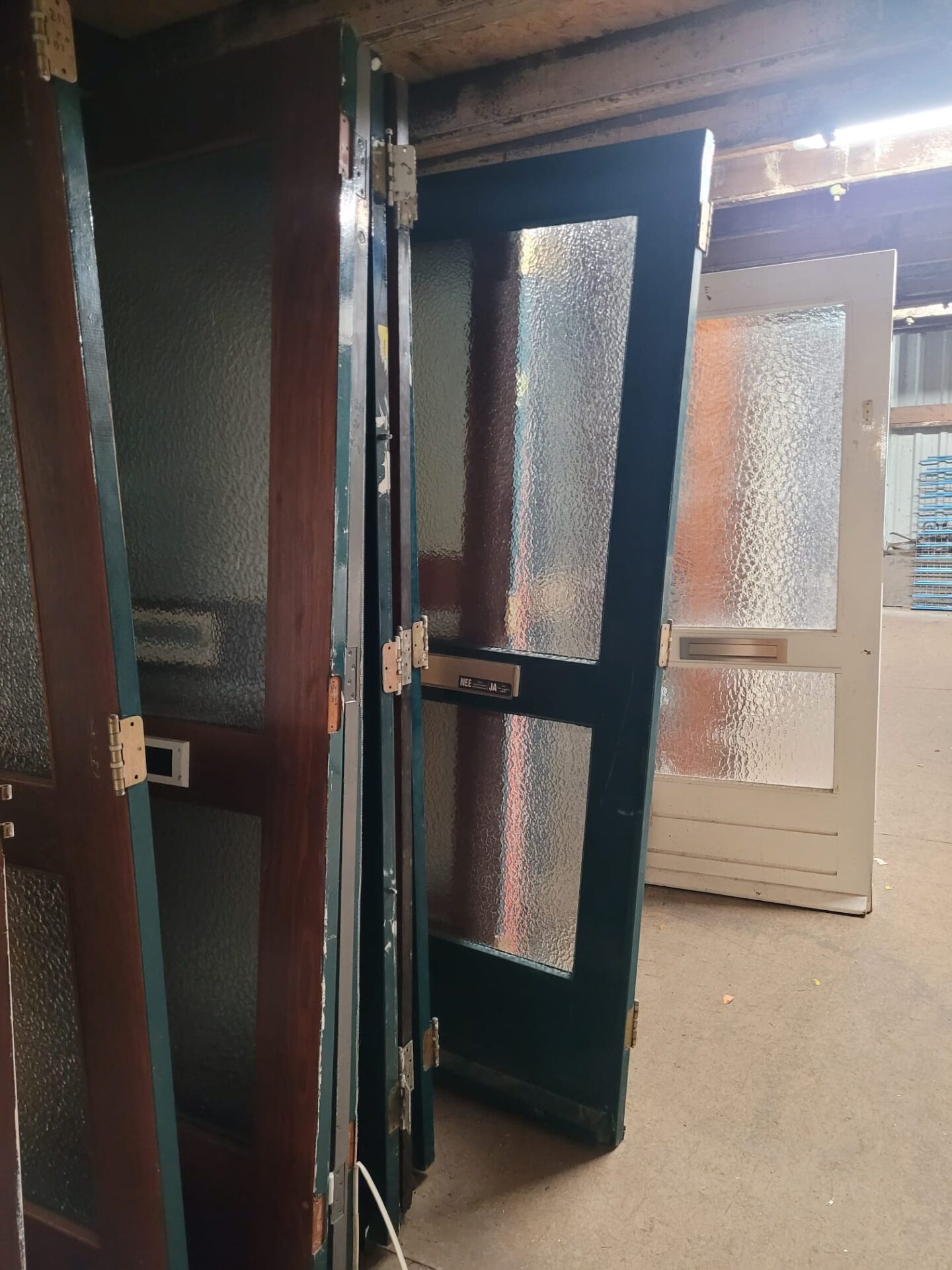 In gang pad 0 op de eerste verdieping staan verschillende voordeuren met twee ruiten van draadglas. Deze deuren hebben een robuuste uitstraling dankzij het versterkte glas en zijn perfect voor wie op zoek is naar karakter en stevigheid in één. De draadstructuur in het glas varieert – van klassiek vierkant raster tot fijner patroon. Daarbij sommige enkel- en de andere dubbel glas.