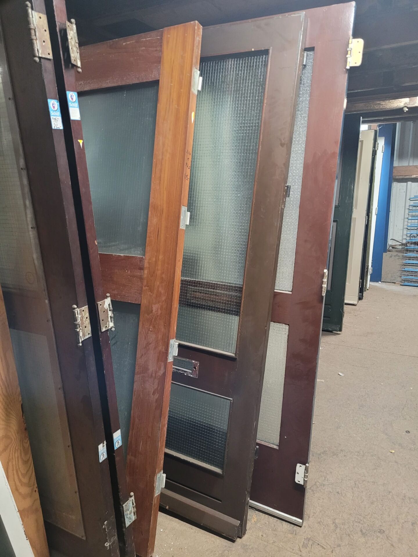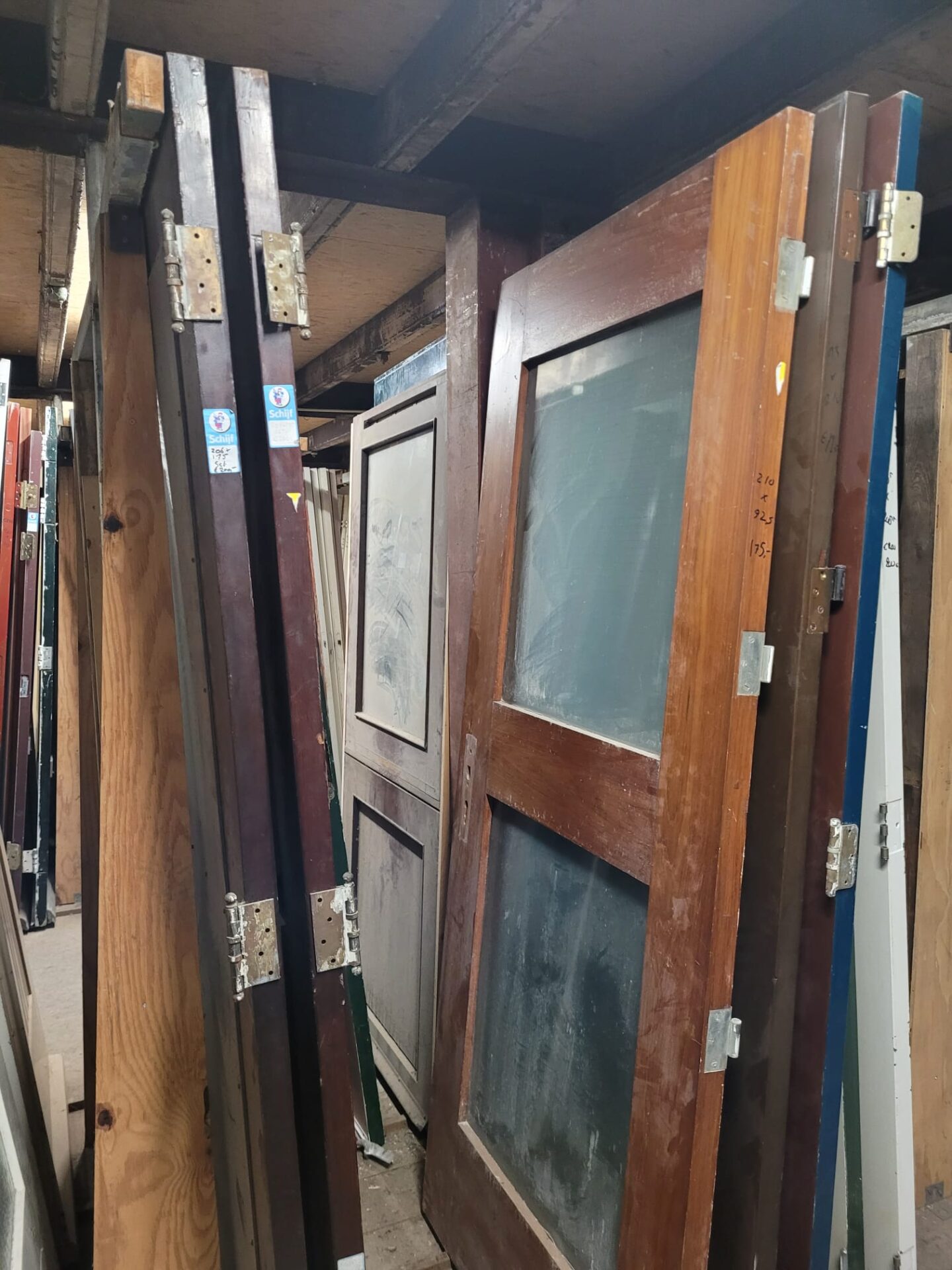 In gang pad 0 op de eerste verdieping staan verschillende voordeuren met twee ruiten van draadglas. Deze deuren hebben een robuuste uitstraling dankzij het versterkte glas en zijn perfect voor wie op zoek is naar karakter en stevigheid in één. De draadstructuur in het glas varieert – van klassiek vierkant raster tot fijner patroon. Daarbij sommige enkel- en de andere dubbel glas.