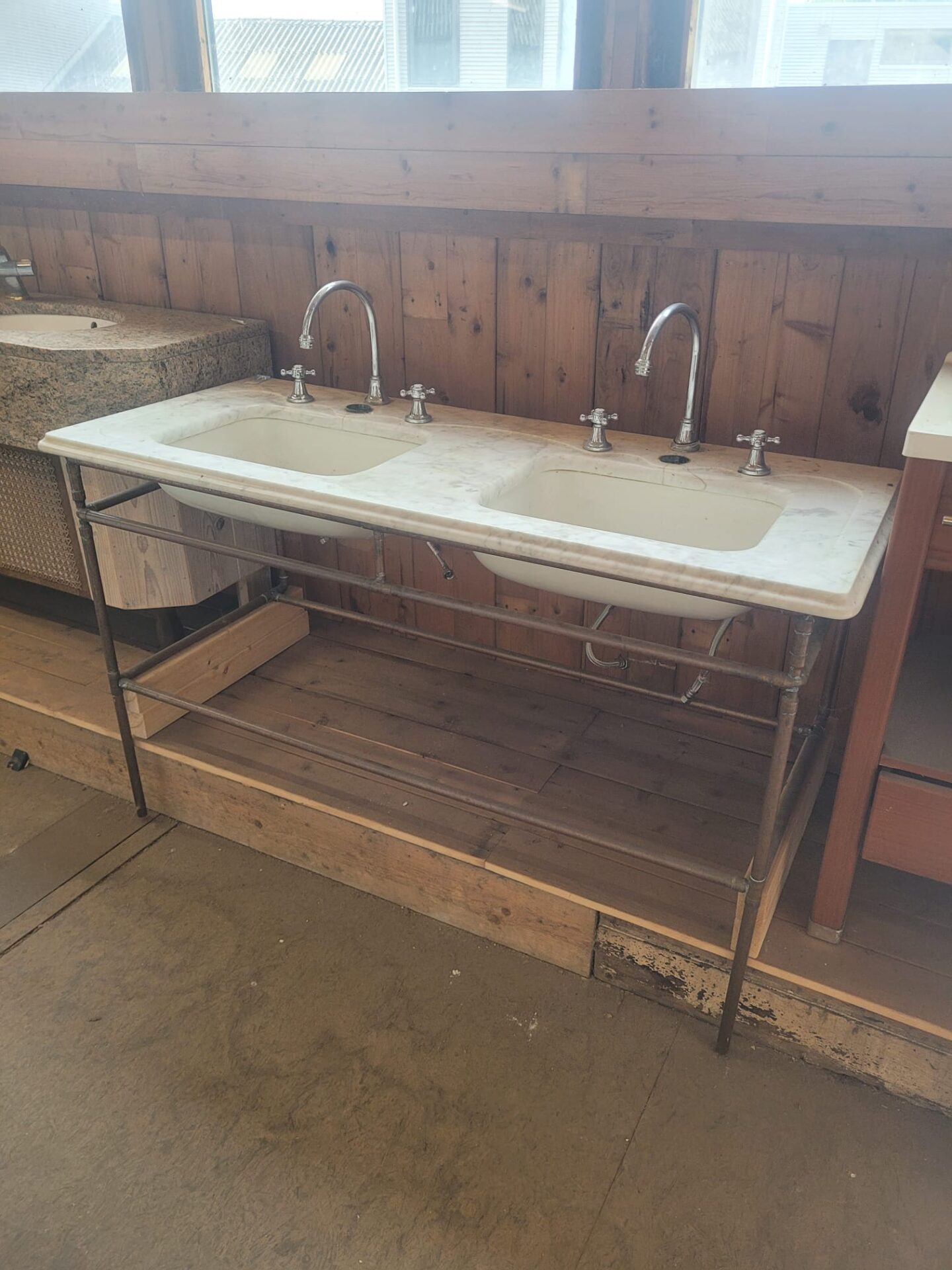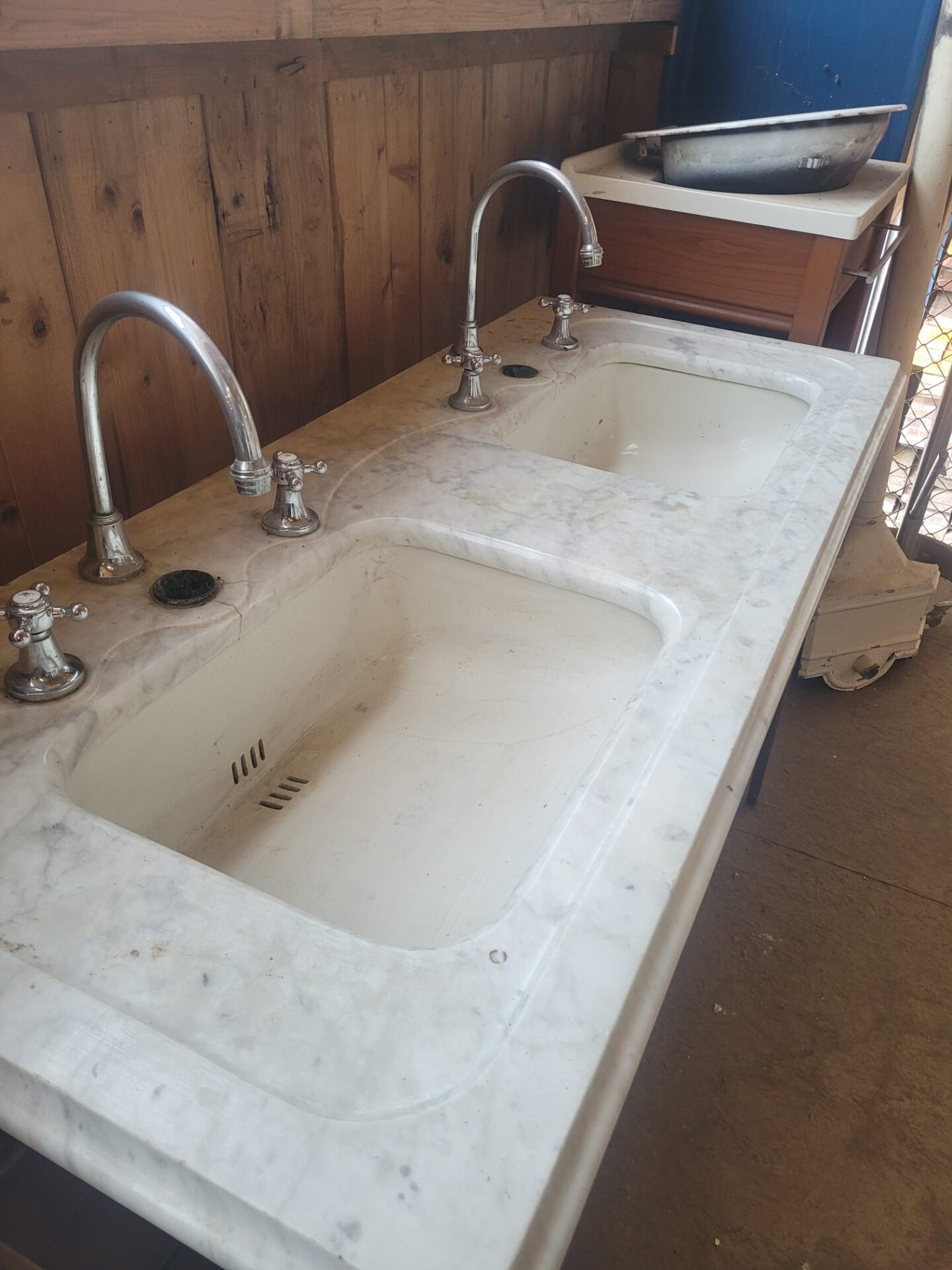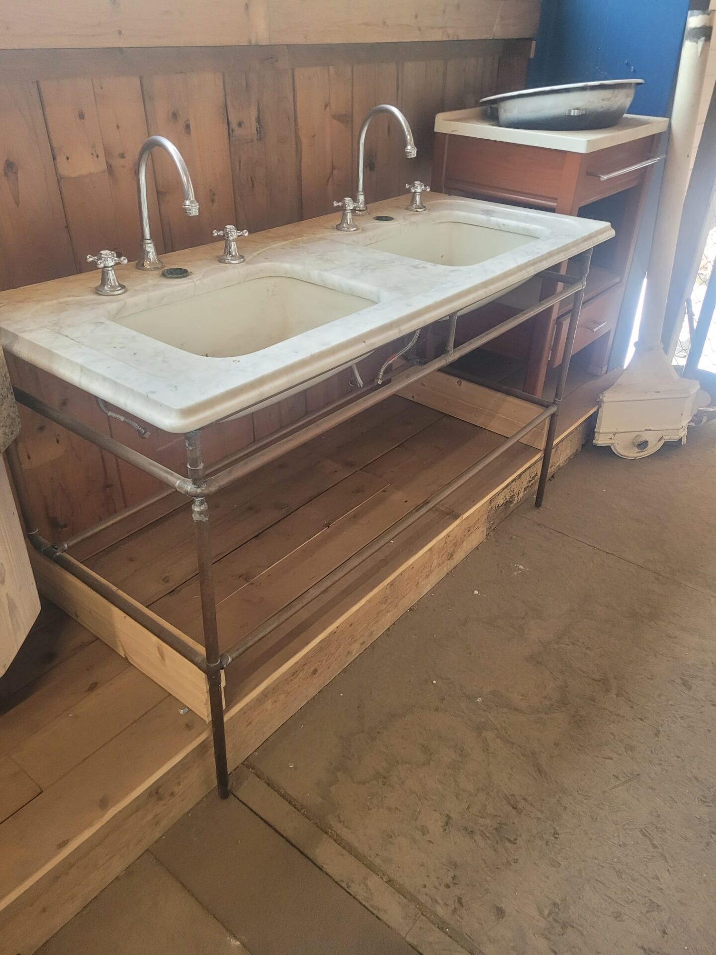 Dit bijzondere wastafelmeubel combineert elegantie en functionaliteit. Het marmeren blad biedt ruimte voor twee wasbakken en is afgewerkt met een stijlvol koperen buizen onderstel. De combinatie van de luxe uitstraling van marmer en de robuuste charme van koper maakt dit meubel een echte blikvanger in de badkamer. Door de open onderzijde oogt het geheel luchtig en blijft er plaats voor handdoeken of mandjes.