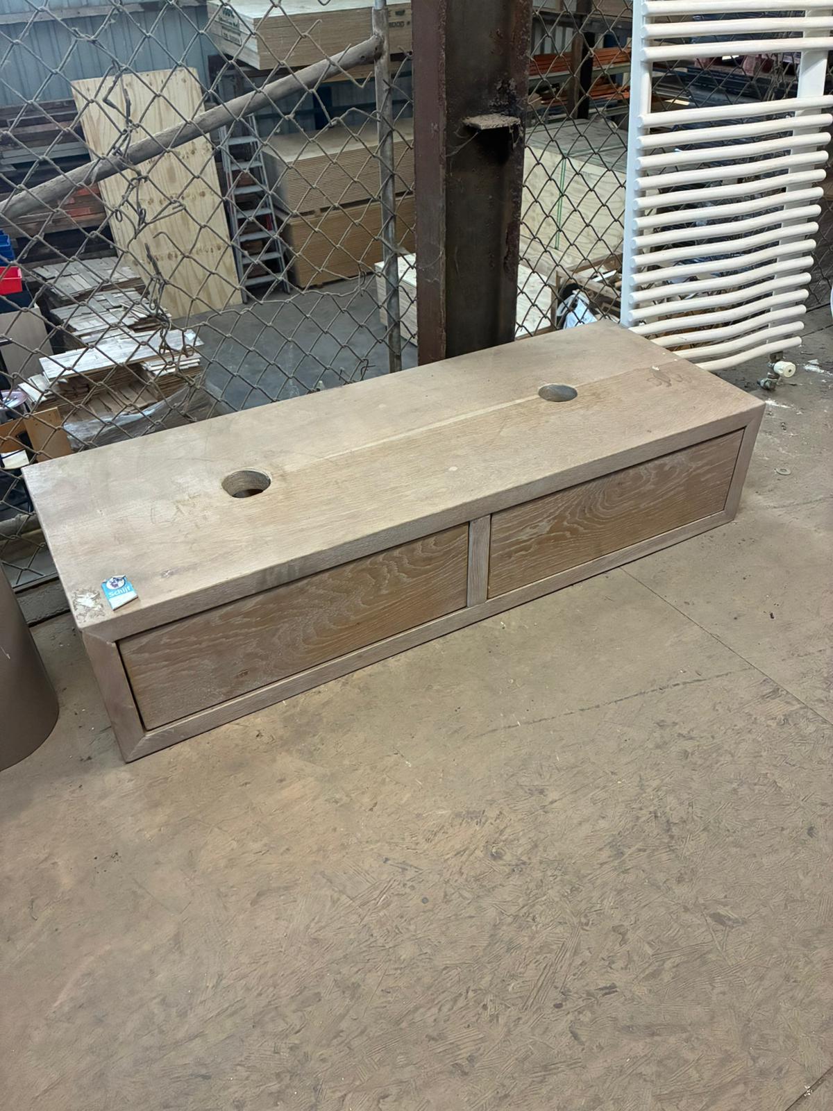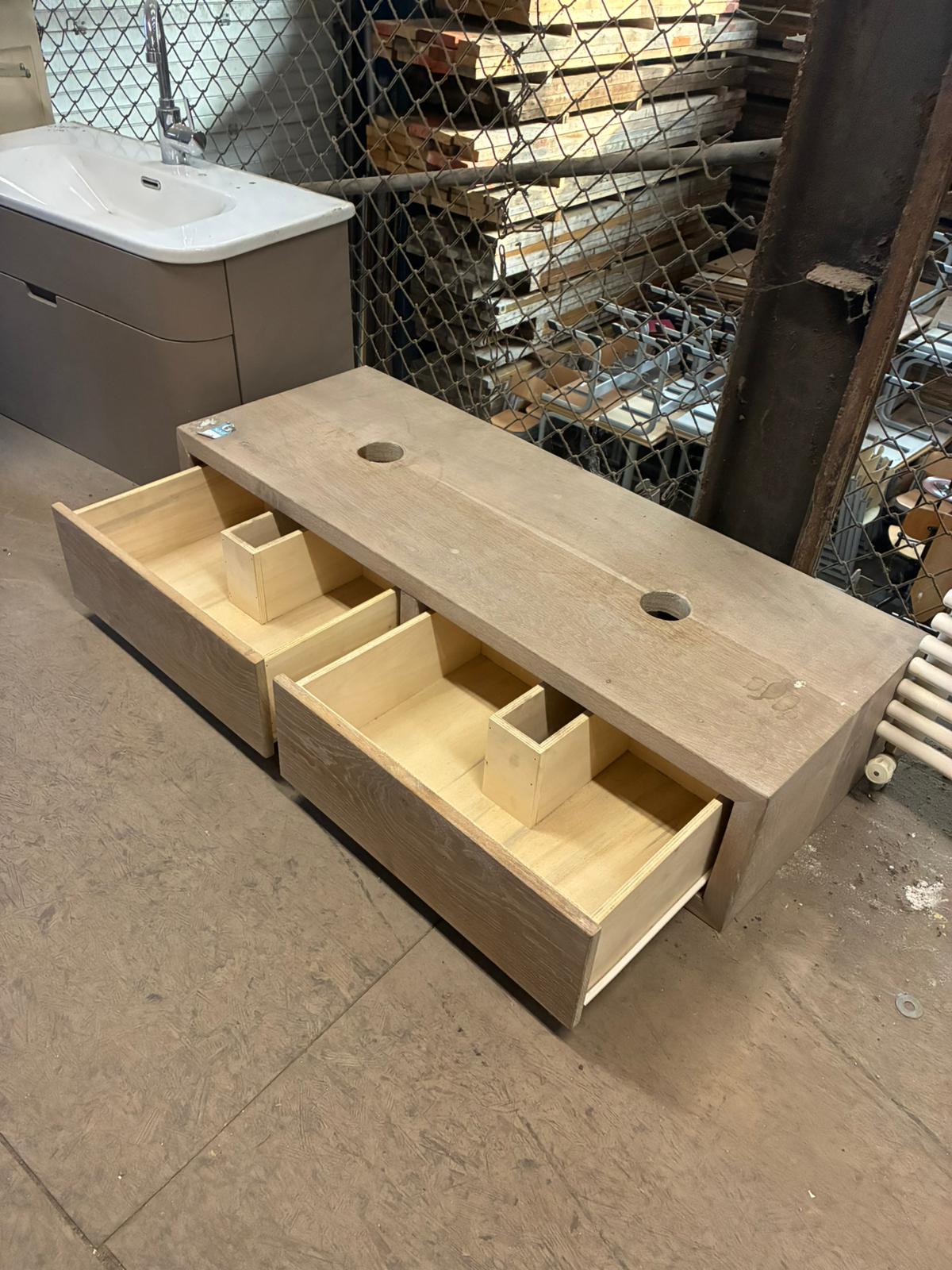 Dit handgemaakte zwevende wastafelmeubel straalt eenvoud en klasse uit. Het meubel is voorzien van twee ruime lades die zorgen voor voldoende opbergruimte voor al je badkamerbenodigdheden. Door de stevige constructie is het meubel ideaal om één of zelfs twee wasbakken op te plaatsen. De natuurlijke uitstraling van het hout maakt dit meubel tijdloos en goed te combineren met verschillende interieurstijlen. Dankzij het zwevende ontwerp blijft de vloer vrij en oogt de badkamer ruimtelijker.